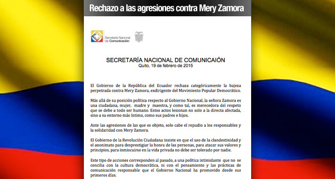 El Gobierno de la República del Ecuador rechaza, categóricamente, la bajeza perpetrada contra Mery Zamora, exdirigente del Movimiento Popular Democrático.