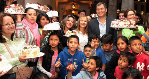 En medio de la multitud, que vitoreaba al Presidente, 20 pasteles (de todos los colores y formas) se robaron los flashes y la atención de las cámaras de los medios de comunicación. Los ciudadanos que los portaban encendían velas y gritaban con fuerza que ese era el regalo para el Presidente. Tras varios minutos, el Primer Mandatario no dudó en invitarlos a pasar al balcón del Palacio de Carondelet para degustar, junto a ellos, esos postres y agradecerles por ese presente.