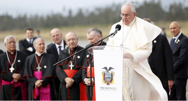 Quito (Pichincha).- “Le agradezco señor Presidente sus palabras, agradezco su consonancia con mi pensamiento (…). A lo que correspondo con mis mejores deseos para el ejercicio de su misión, que pueda lograr para el bien de su pueblo” expresó el Papa Francisco durante su intervención a su llegada al Ecuador, en referencia al discurso de bienvenida por parte del Presidente Rafael Correa, en el cual citó varias frases del Santo Padre.